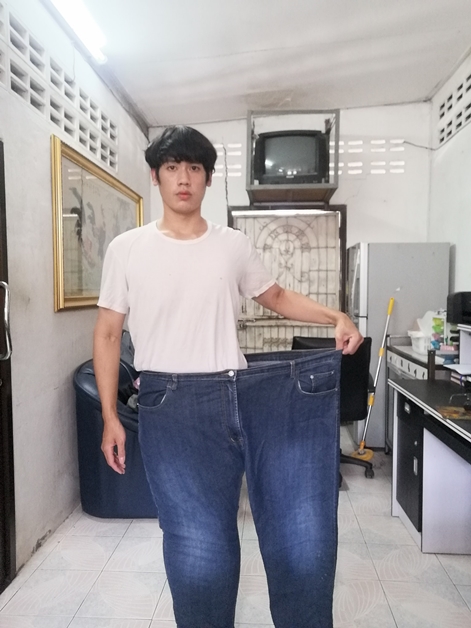 ▼瘦身成功後,Nes Chedtragull特別拿出以前破百公斤時穿的外套、褲子,套在身上拍攝對比照,差異果然非常大。