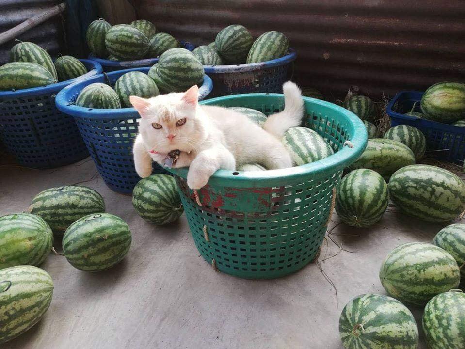2022年06月17日做生意不是要和氣生財嗎?最近臉書粉絲專頁「泰國清邁象」分享了一隻叫「珍珠」的貓咪的故事。珍珠的主人是一位瓜農,不管去田裡耕作採收,還是去市場賣西瓜,珍珠都會跟在旁邊。牠表情超兇監督主人工作,連來買西瓜的客人也得不到牠的好臉色。但大家還是被珍珠吸引,很喜歡去牠家的攤位買西瓜~