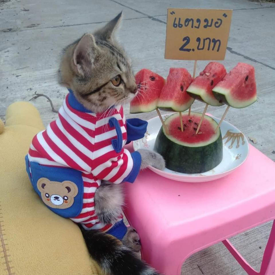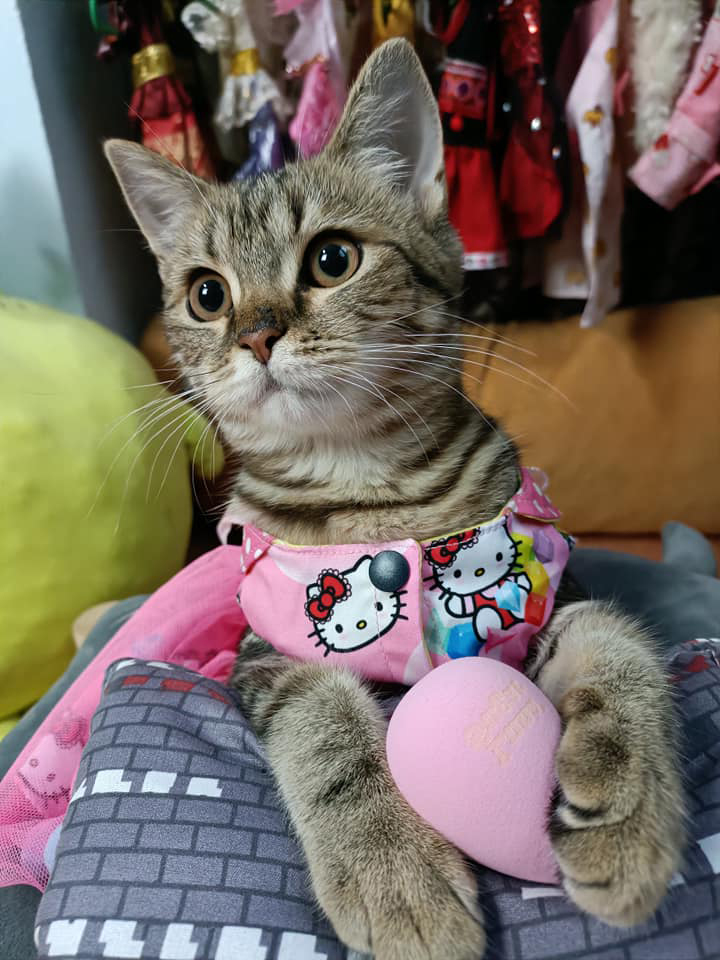 Bong Bong本身就是一隻網紅貓咪,在網路上小有名氣。主人會為牠添置不同風格的新衣,牠也十分百搭,不管穿什麼都可愛。如果牠真的外出擺攤賣菜,生意一定很好吧!