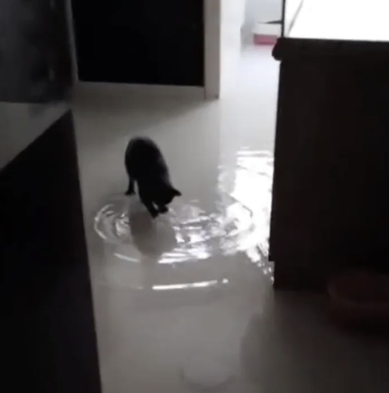 一覺醒來家裡被水淹! 他抓包「水上樂園現場」喵皇得意踩踩傻眼