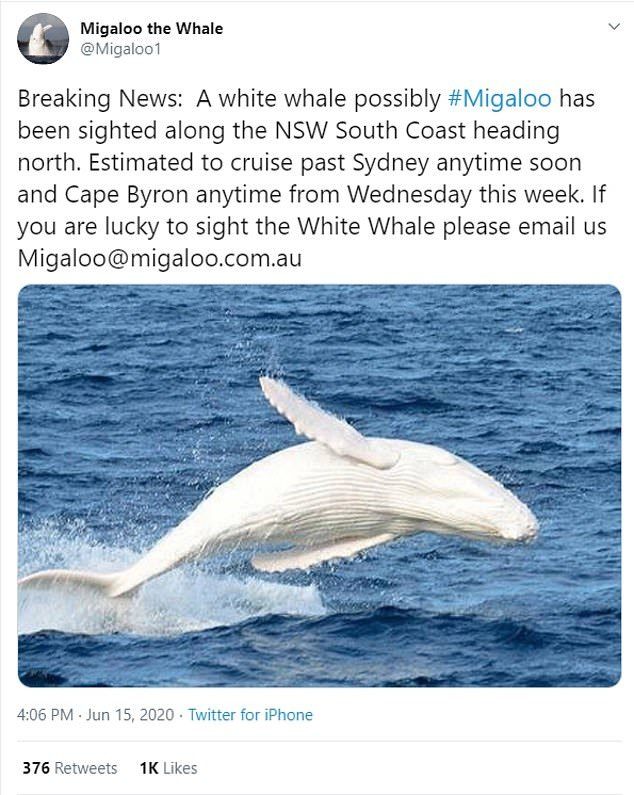 ▼研究人員專門設立推特帳號「@Migaloo1」,跟大家分享稀有動物的訊息。6月15日他們po文說:「在新南威爾斯州南海岸發現了一隻向北行進的白鯨,可能是Migaloo。牠預計會在短時間內經過雪梨,本週三經過拜倫角。」