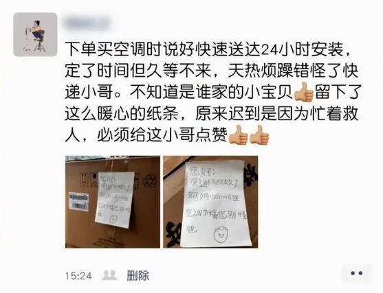 2023年08月06日如果人與人之間多一點體諒,我們的世界會更美好!大陸一名女子跟送貨員約好時間,等對方來安裝冷氣機。但約定的時間過了半個多小時,送貨員還是沒有到。她本來非常氣,但冷氣機送來後,看到包裝上貼的一張紙條,她馬上氣消了!