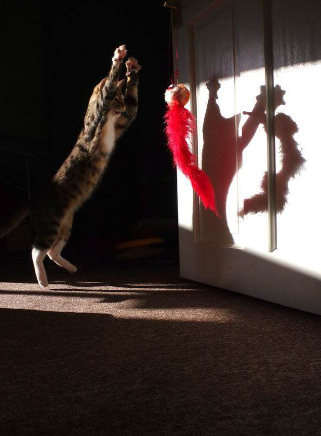 ▼Edmund活力無限,不管用什麼玩具跟牠玩,牠都能百分百投入,而且蹦蹦跳跳不嫌累。McConnell準備了逗貓棒,這應該是Edmund最喜歡的東西了,牠追著逗貓棒跳到空中,專注的眼神就像在捕獵一樣。