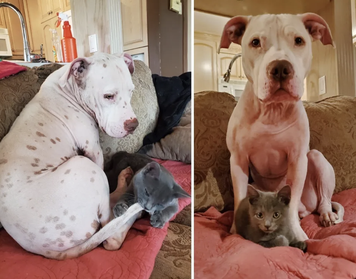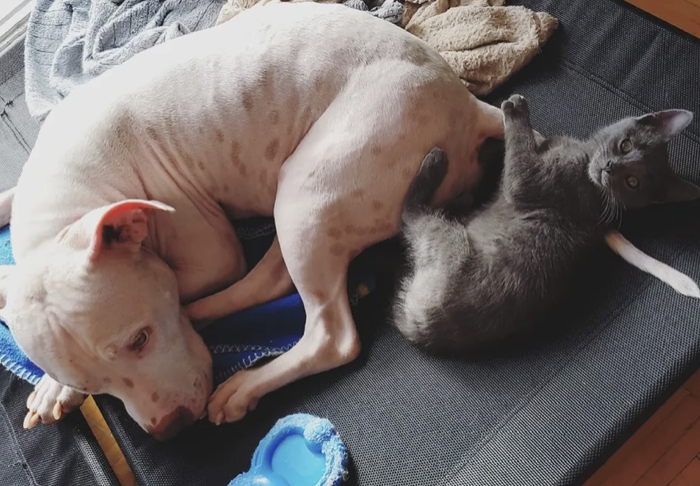 ▼Félix雖然身體虛弱,性格卻很開朗。牠很快就適應新家的環境,表現得自信又愉悅。當時Meg家裡的一隻狗狗剛剛去世,那隻狗狗的好友Casper還沈浸在悲傷中,Casper跟Félix很快建立聯繫,牠們整天一起玩耍,還會擁抱、一起睡覺。