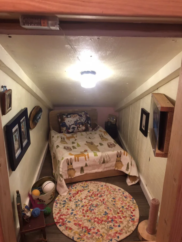 ▼Bryan改造小空間的牆面,還裝上燈泡,並添置小床等傢俱。他還在牆上掛了一些貓咪主題的畫,來增添品味和格調。