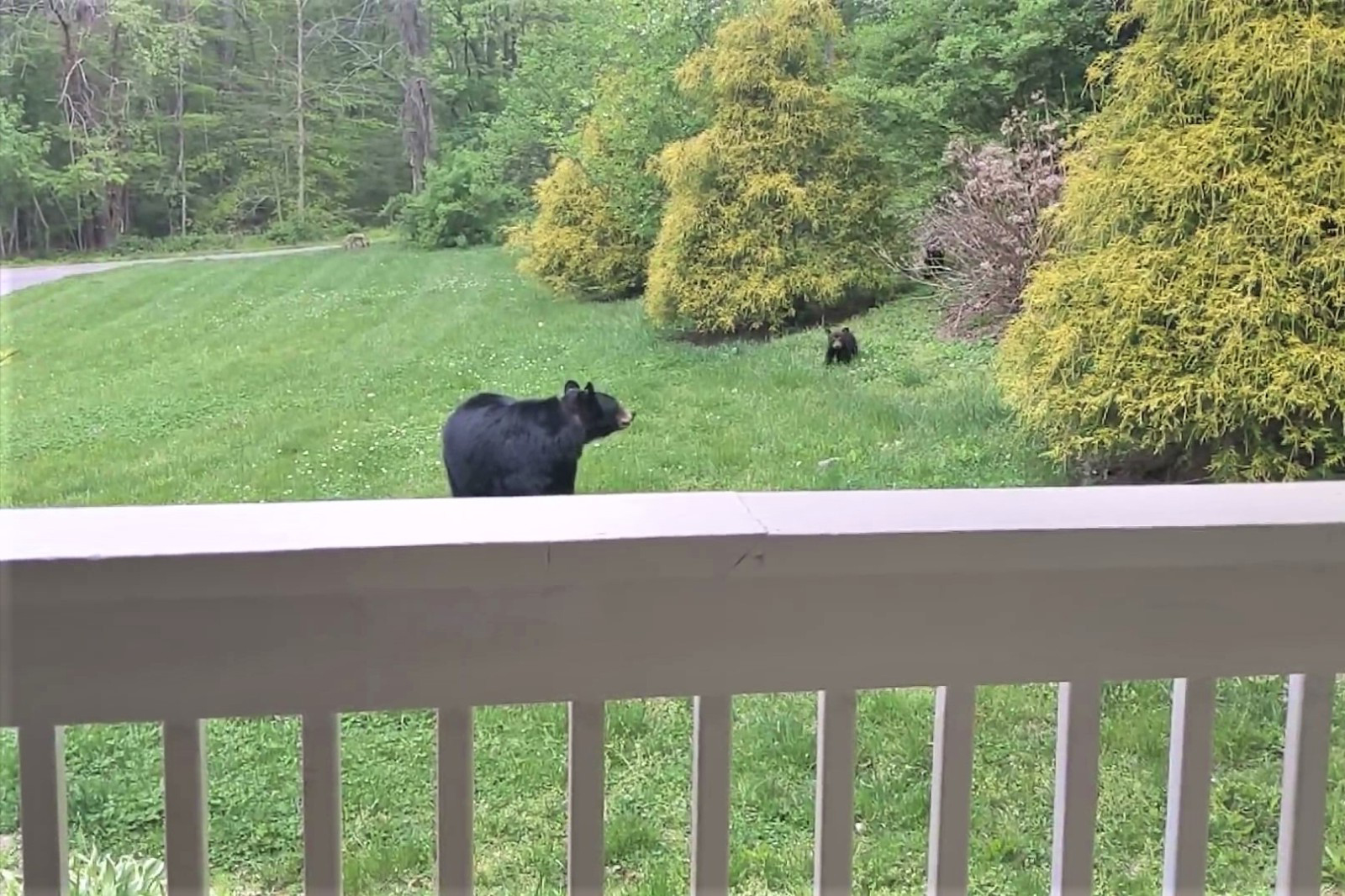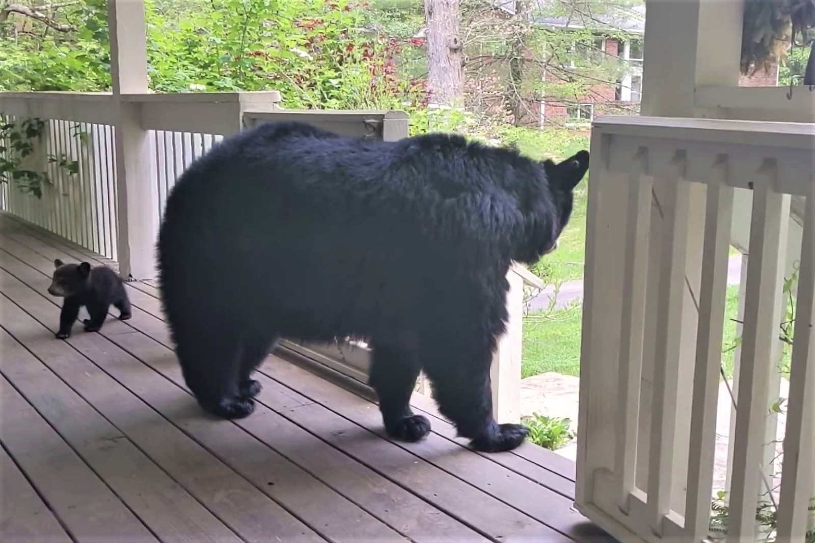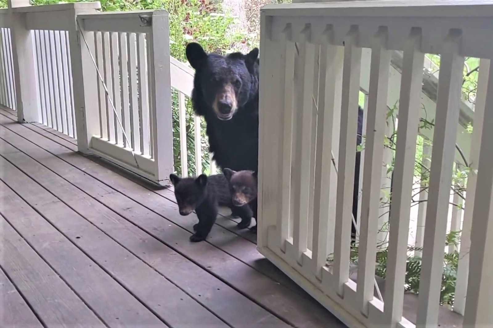 ▼只見幾隻熊寶寶跟在Simone身後,好奇又羞怯地爬上門廊。牠們在媽媽的帶領下跟Conley打招呼,然後又跑到後院玩耍。