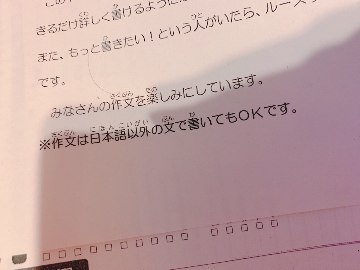 ▼作文作業的兩張稿紙回來後變成「滿江紅」,但是並不是因為寫錯,而是因為寫滿了老師解讀出的日文羅馬拼音,老師並且寫下評語:「我花了3個半小時左右解讀,雖然寫得很好,但是請用一般的方式寫」,並蓋了「很努力了呢」印章,老師還在旁邊強調加註:「這是在誇獎我自己,加班費拿來」。