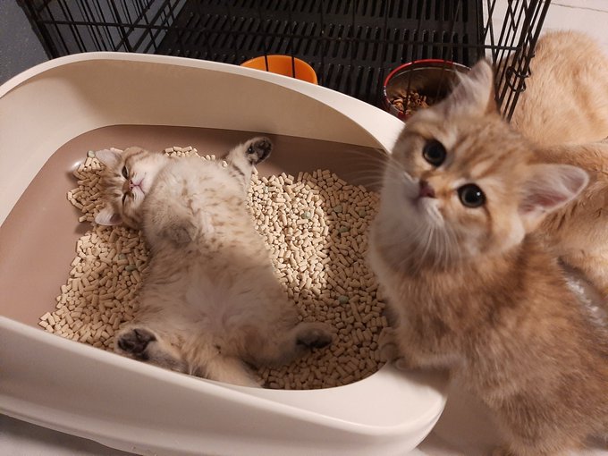 ▼飼主偶然拍到小橘貓霸佔廁所的一幕。牠躺在貓砂上呼呼大睡,另一隻小貓站在旁邊一臉無助,向飼主發射無辜眼神射線求助。