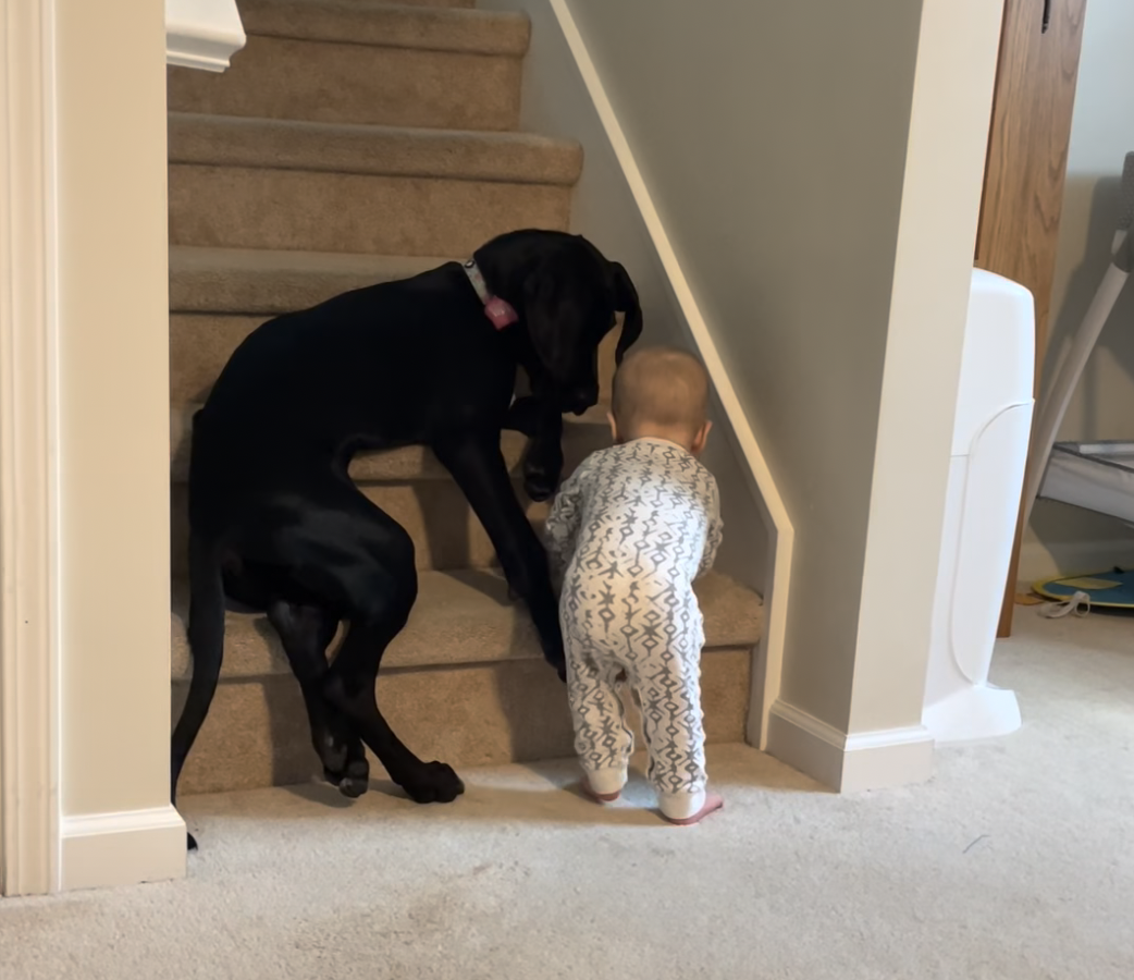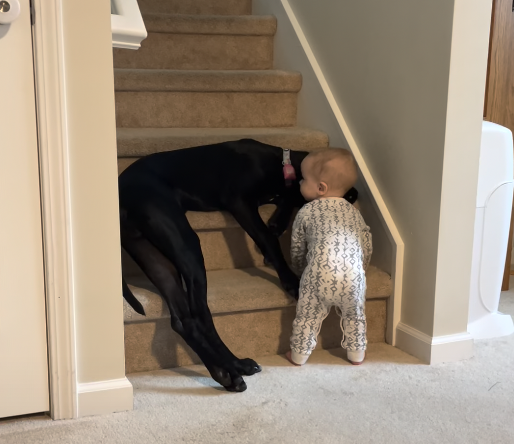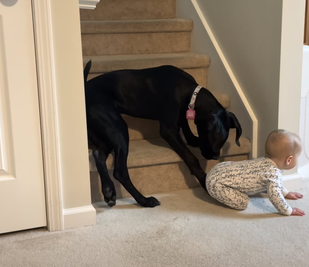 ▼那一天小哥哥來到樓梯前,他已經會站、會爬,對周圍的世界充滿好奇,這次想要試著爬樓梯。Lisa看到後連忙阻止,牠整隻狗躺到樓梯上,擋住小哥哥探索的腳步,好像在說:「你現在還不能爬喔,這樣做太危險啦。」
