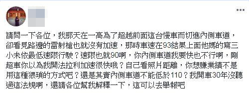 ▼一位網友在臉書社團上表示,自己在國道一號中山高速公路上為了超車,切進內側車道,卻被路邊取締員警照相開單。他質疑自己車速已達「時速93公里」了,為什麼會被拍照取締,「還是其實內側車道不能低於110?我開車30年沒聽過這法規啊!還請各位幫我解釋一下,這可以去舉報吧?」