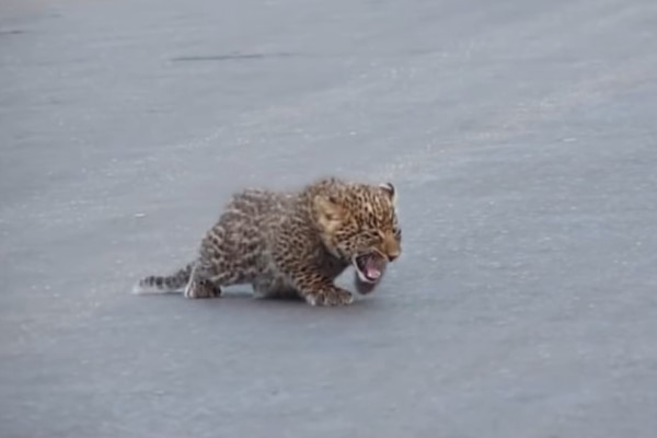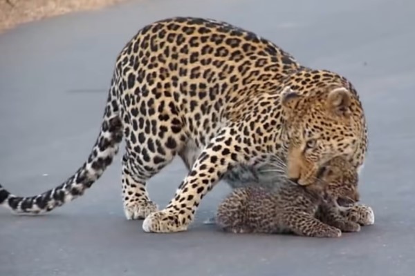 豹媽教過馬路!小奶豹短腿跟不上 直接「坐路上哇哇叫」:馬麻等我~
