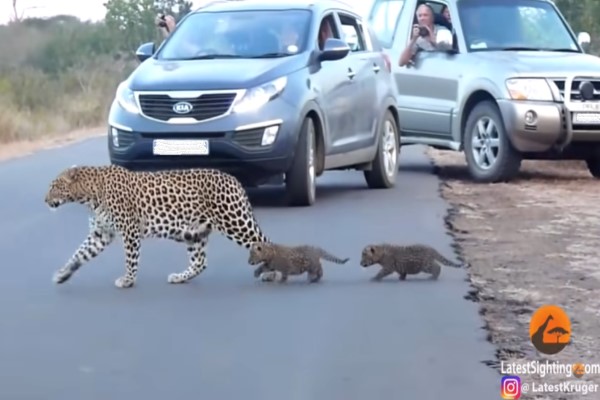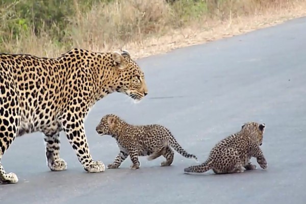 2021年06月24日不管動物還是人類,在育兒方面都會遇到很多問題。64歲攝影師Thinus Delport和家人到南非克魯格國家公園遊玩時,就遇到了一個花豹家庭。花豹媽媽正在教2隻小豹安全過馬路。Thinus連忙拍下了那珍貴的一幕!