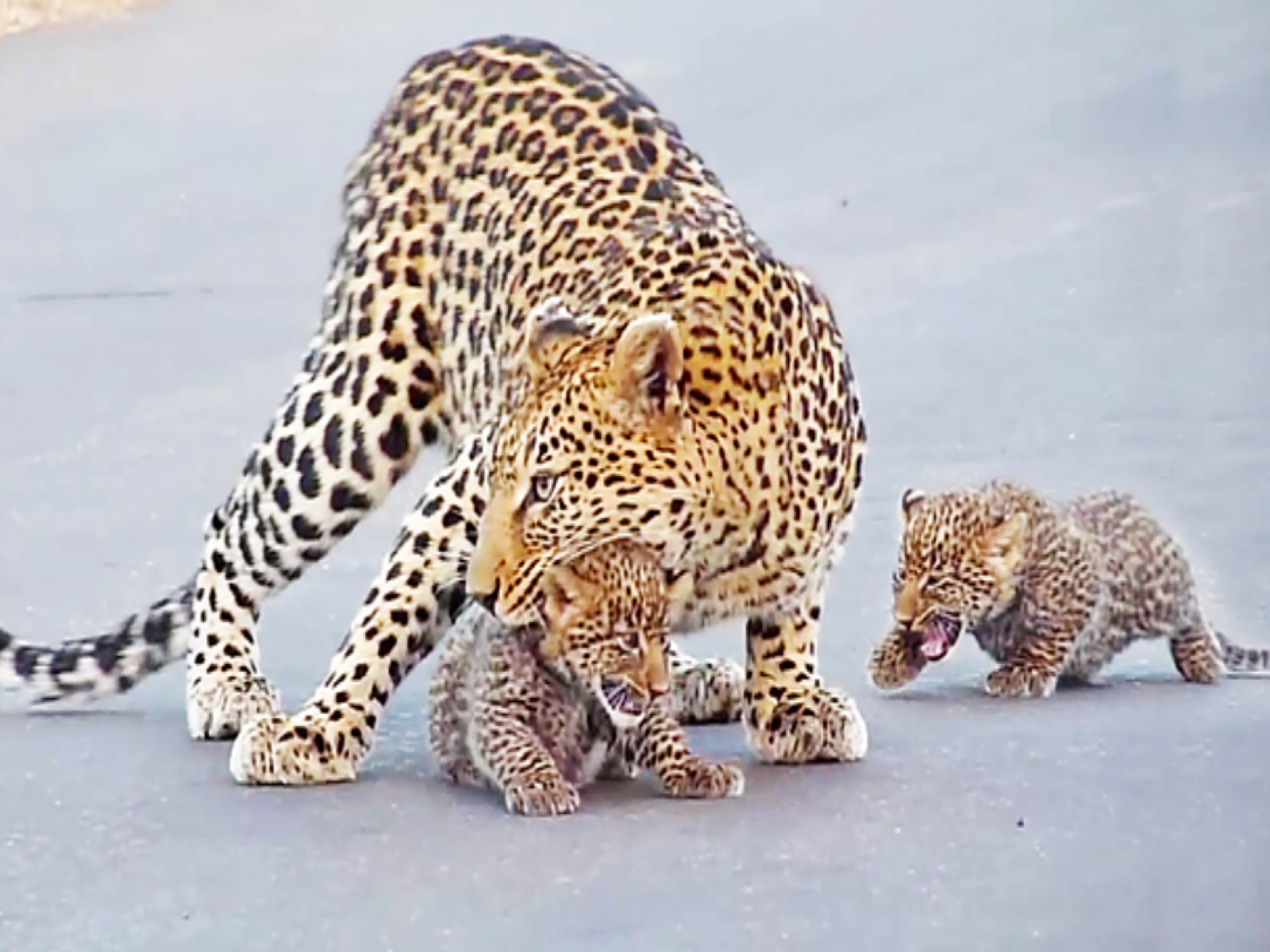 ▼花豹媽媽帶2個小孩過馬路: