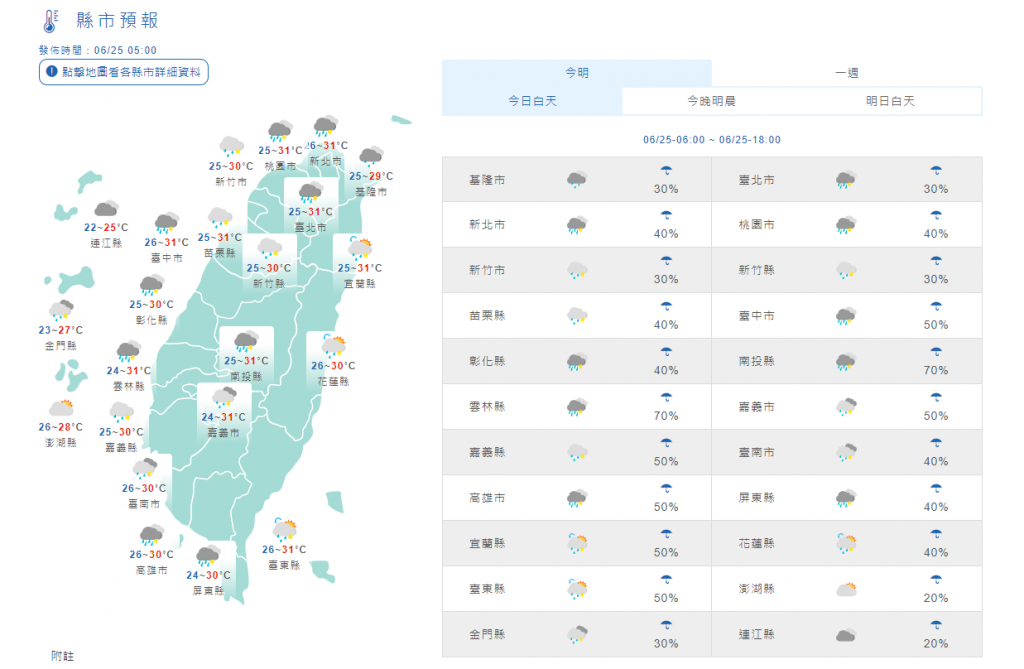 中央氣象局指出,鋒面北移,各地仍有局部陣雨或雷雨機率。清晨以南部局部大雨為主,午後南部山區、東半部都有雨,西半部地區也有局部短暫陣雨。溫度方面,各地天氣稍涼,北部23至32度,中部23至33度,南部23至33度,東部22至33度。