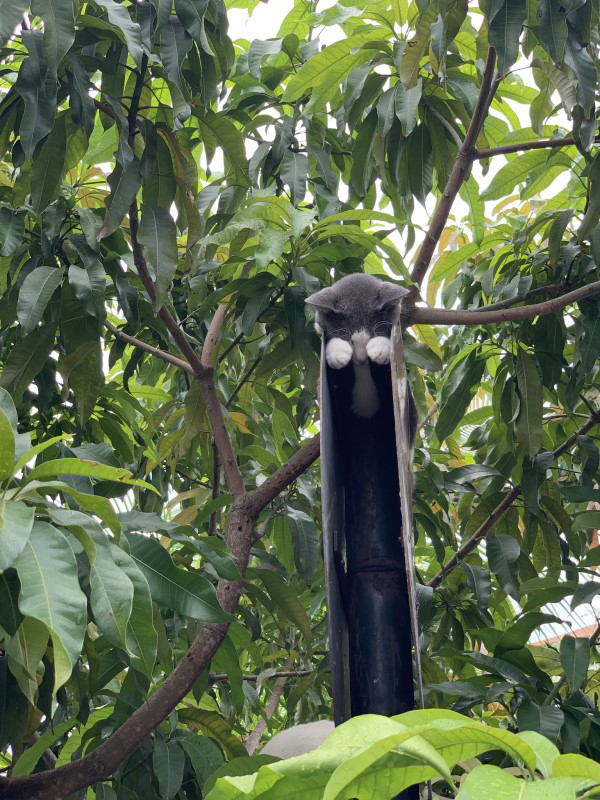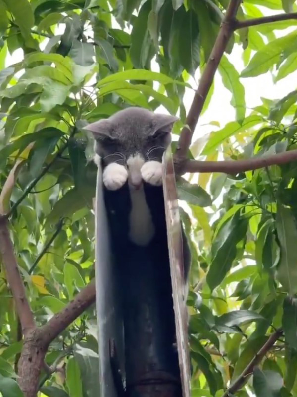 ▼貓咪趴在桿子上熟睡,可愛的山竹手手舉在眼前。推主擔心牠被困住,於是試著叫醒牠。沒想到牠聽到後稍稍睜開眼睛看了一下,然後又繼續睡覺,一點也不在乎別人的眼光。