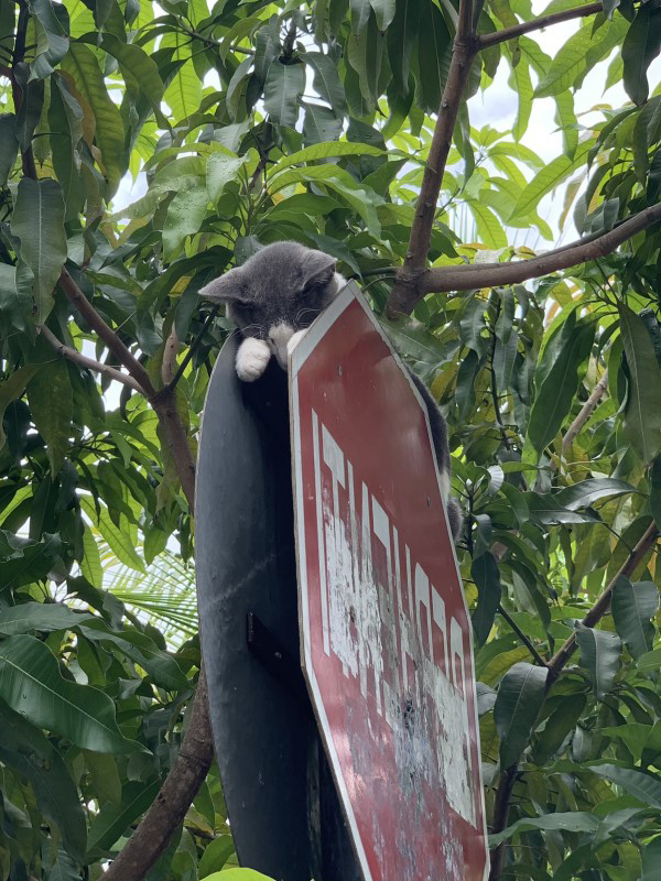 ▼推主發現,路邊的紅色交通號誌上有「毛茸茸」的東西。他走近一看,才發現那是一隻灰白貓咪,牠將自己夾在寫著「停車」的交通號誌板子中間 。這個位置對牠來說剛剛好,上面還有樹葉遮擋,正適合睡覺。