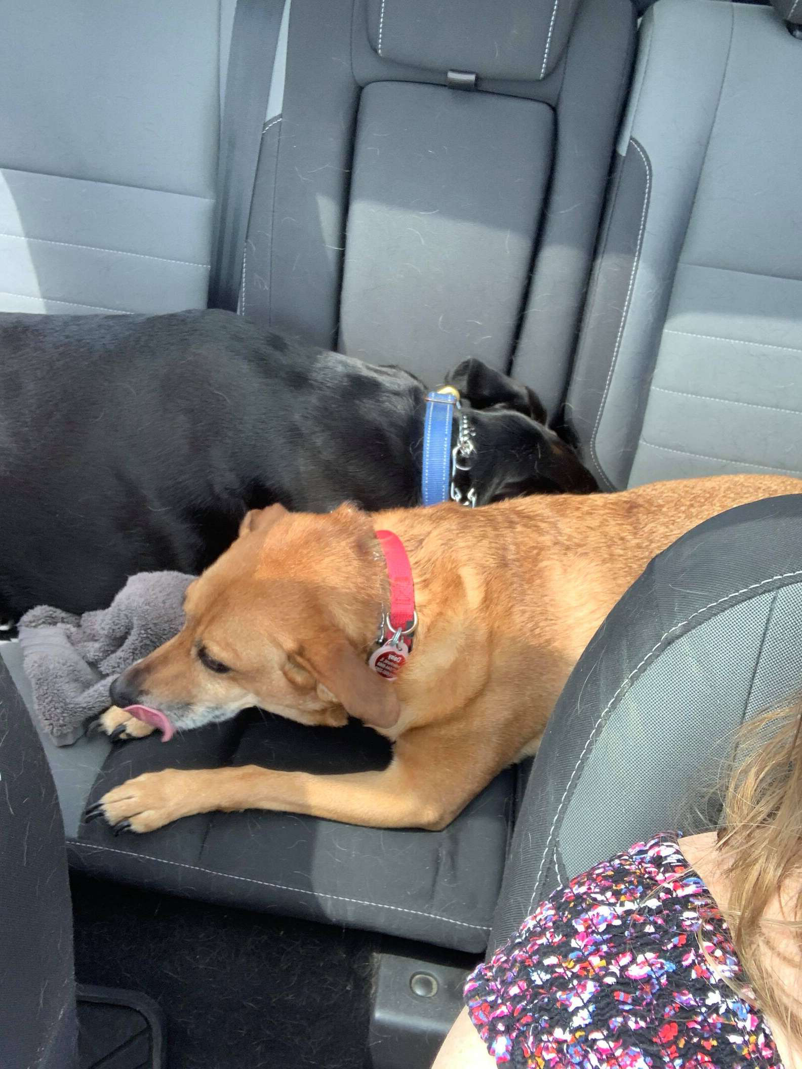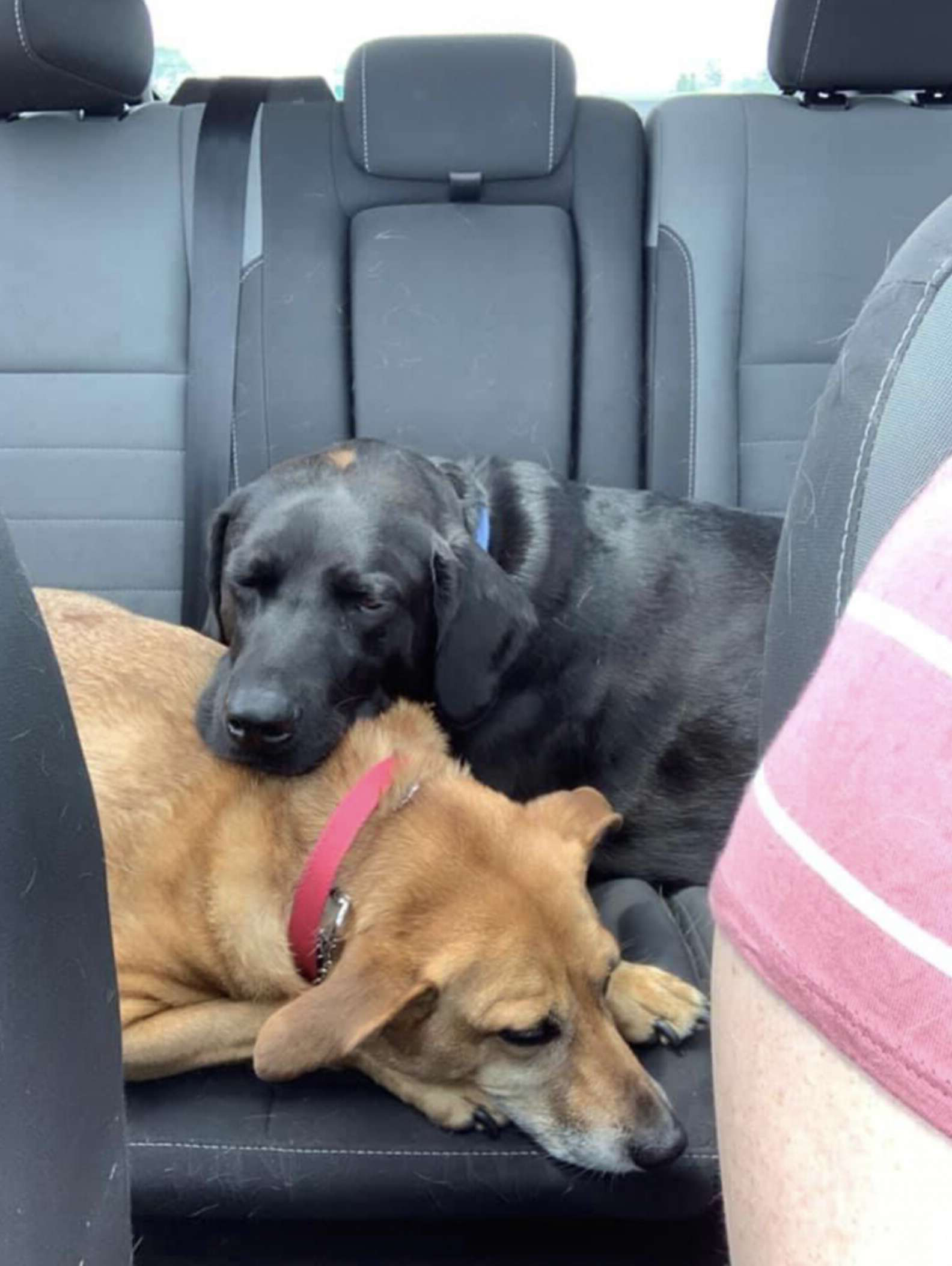 ▼Eddy來到家裡後,每次Daisy坐車害怕,牠都會好好安慰牠,幫助牠化解害怕的情緒。現在Daisy已經不怕坐車了,兩隻狗狗一起在後座,牠還能安心睡覺。看到狗狗們靠在一起的溫馨場景,Ashley覺得非常感動。
