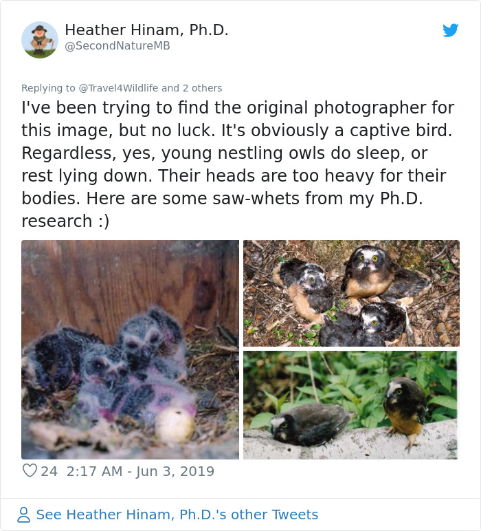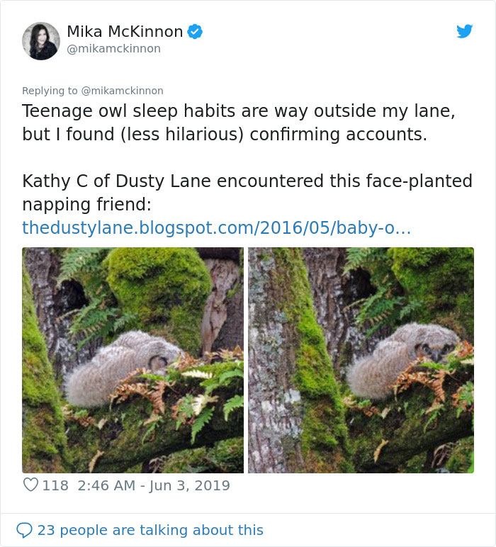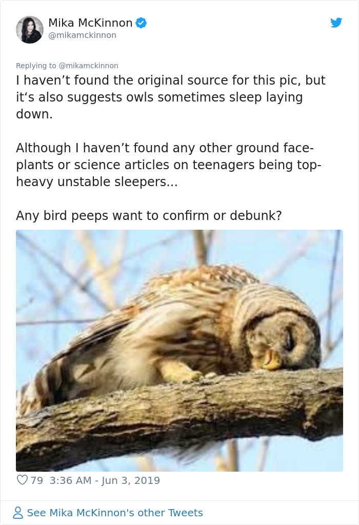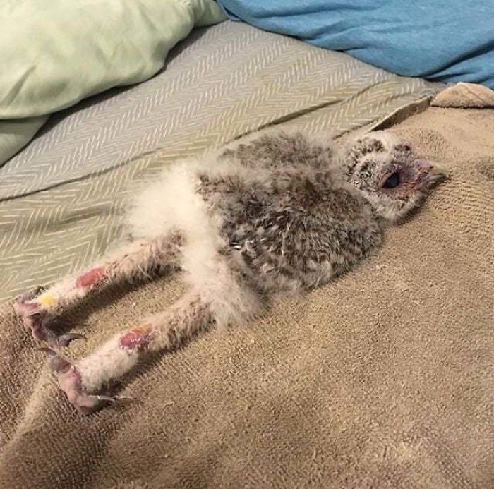 ▼這張照片很快就在網路上流傳開來,貓頭鷹寶寶的奇特睡姿,還有大長腿引發討論。更多網友分享貓頭鷹寶寶的照片,牠們現在已經成為網路上的明星了: