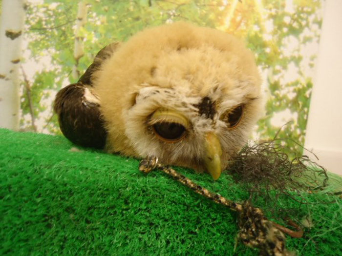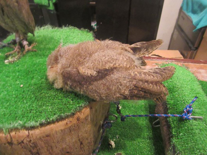 ▼貓頭鷹的毛色很特別,快跟周圍的毛毯融為一體了。