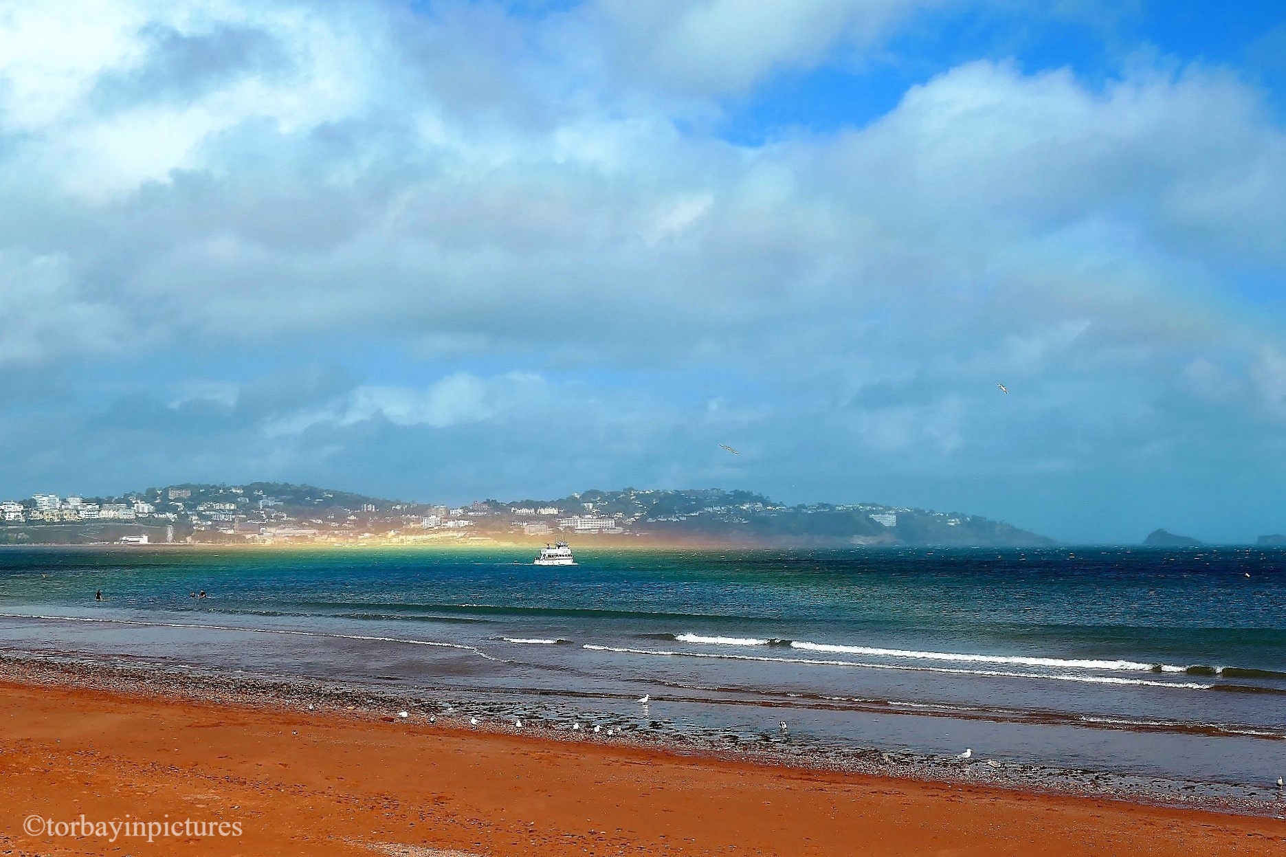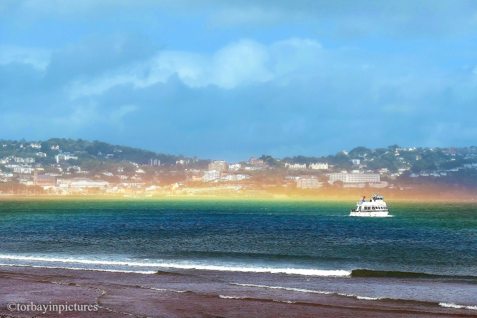 ▼「弗朗西斯」離開後,一名攝影師Torbay在英國西南方的德文郡(Devon)海岸拍到了奇特的「水平彩虹」。從照片中可以看到,海岸遠方透著彩色的光芒,迷蒙的紅色到藍色彩虹跟海平面連接,就像海上升騰出一股多彩的霧氣一樣。