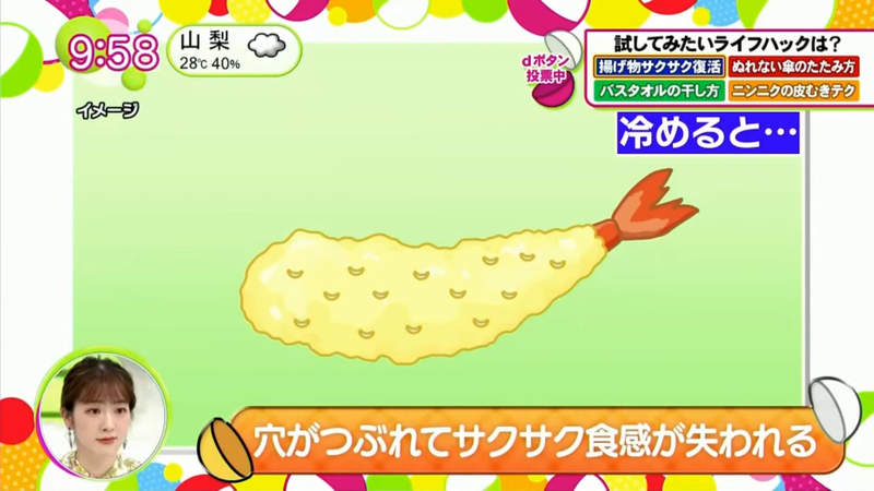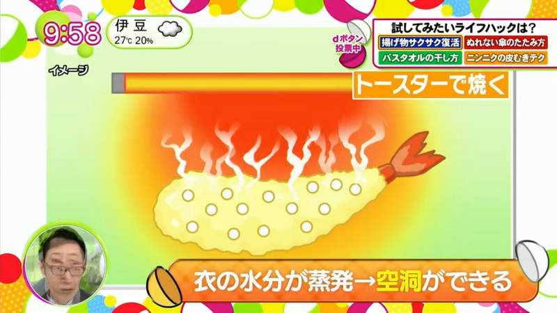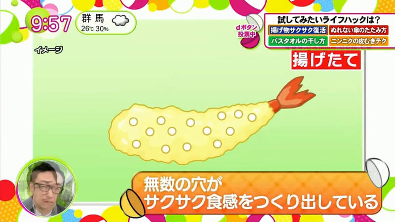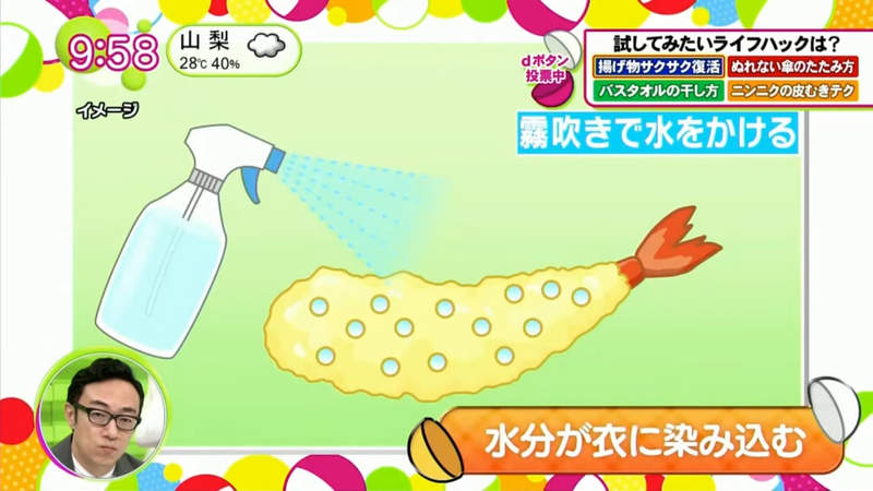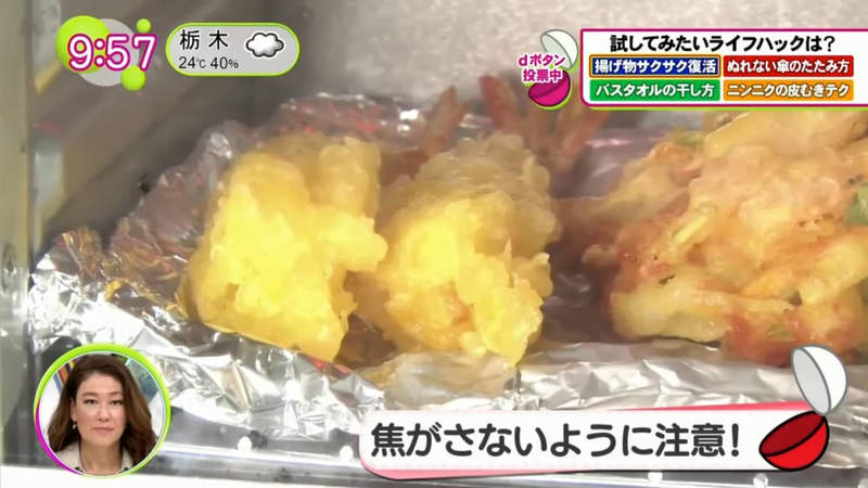 ▼這樣做為什麼會讓炸物復活呢?營養師說,炸物的酥脆口感源自麵衣中的無數孔洞。食物冷卻之後孔洞就會萎縮,酥脆口感也就沒有了。