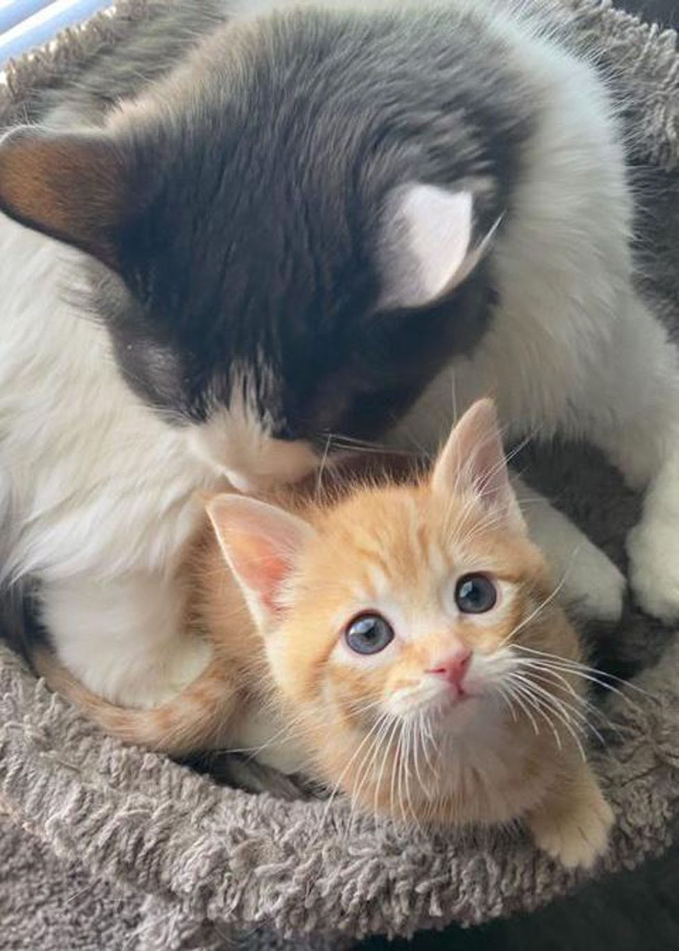 ▼Winnie斷奶後,Kali介紹牠給一隻叫Turtle的貓咪認識。Turtle是收容所的「貓咪志工」,牠非常溫柔,能幫助工作人員安慰其他被救助的貓咪。Winnie很快就愛上了這個大哥哥,很喜歡纏著Turtle玩鬧。