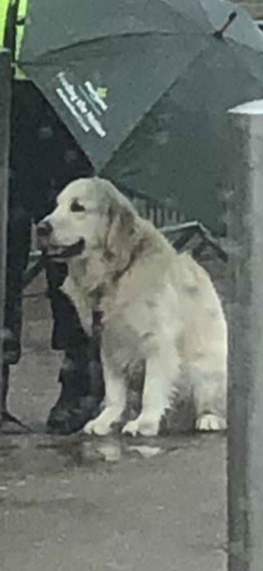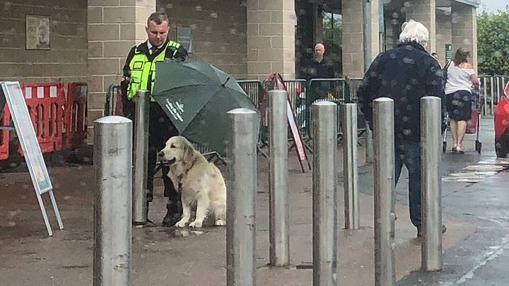 乖巧汪「超市外淋雨」等主人! 暖警衛靠前「讓出整支雨傘」陪伴:小心別感冒囉~