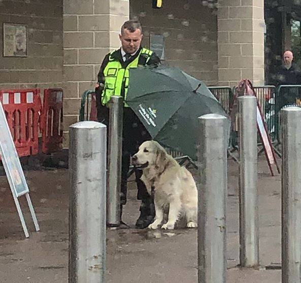 ▼6月28日那天,Ethan像往常一樣在超市外巡邏。天空突然下起大雨,人們腳步匆匆,Ethan卻注意到了一隻白色的狗狗。牠被拴在店外的鐵柱上,主人還沒有購物出來,牠只能默默坐在那裡淋雨。