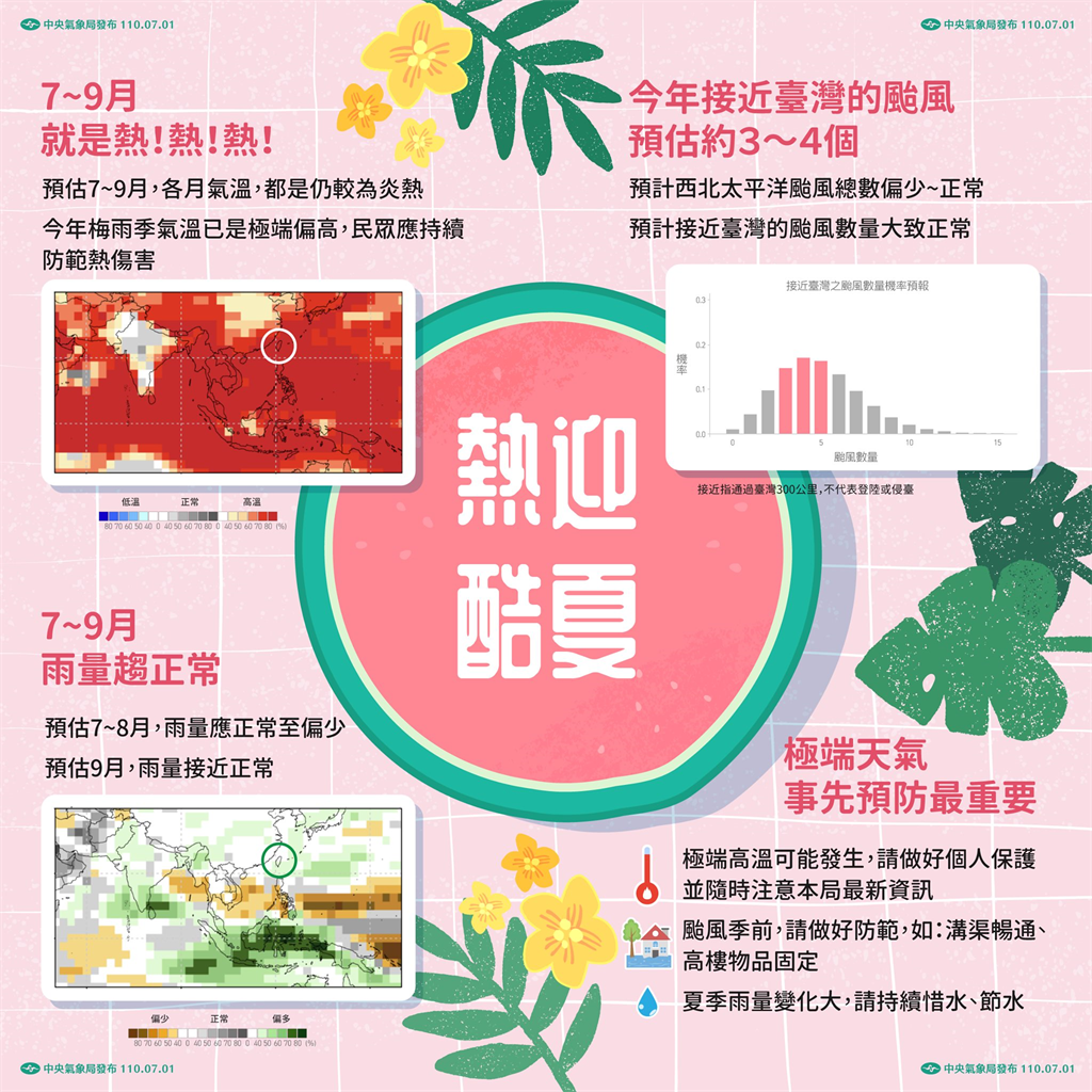 氣象局預估,今年7、8、9月的氣溫全都偏高、偏熱,反聖嬰影響持續減弱。今年颱風趨勢有望偏向正常,靠近台灣300公里以內的颱風數量,最有可能在3到5個之間,接近過往平均值,但靠近並不等於登陸。降雨量方面,7、8月為正常到偏少;9月接近正常。整季的雨量將落在正常範圍內。高溫炙熱的盛夏即將到來,一定要注意防暑降溫~