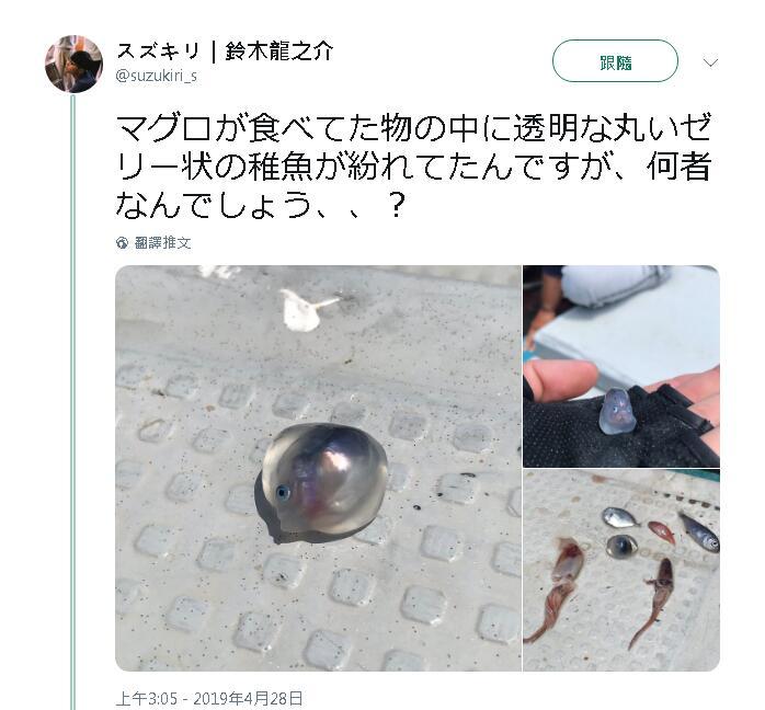 2022年06月27日大海中有很多奇妙的生物。日本網友鈴木龍之介非常喜歡垂釣,不久前他到海邊釣魚,竟然在一條鮪魚肚子裡發現了神秘的果凍狀生物。這條小魚非常迷你,全身透明,看起來很Q萌。他沒有見過這樣的魚類,po到推特上引起了網友們的大討論。