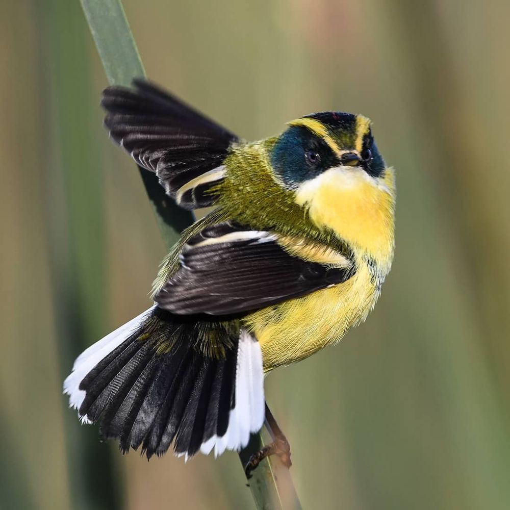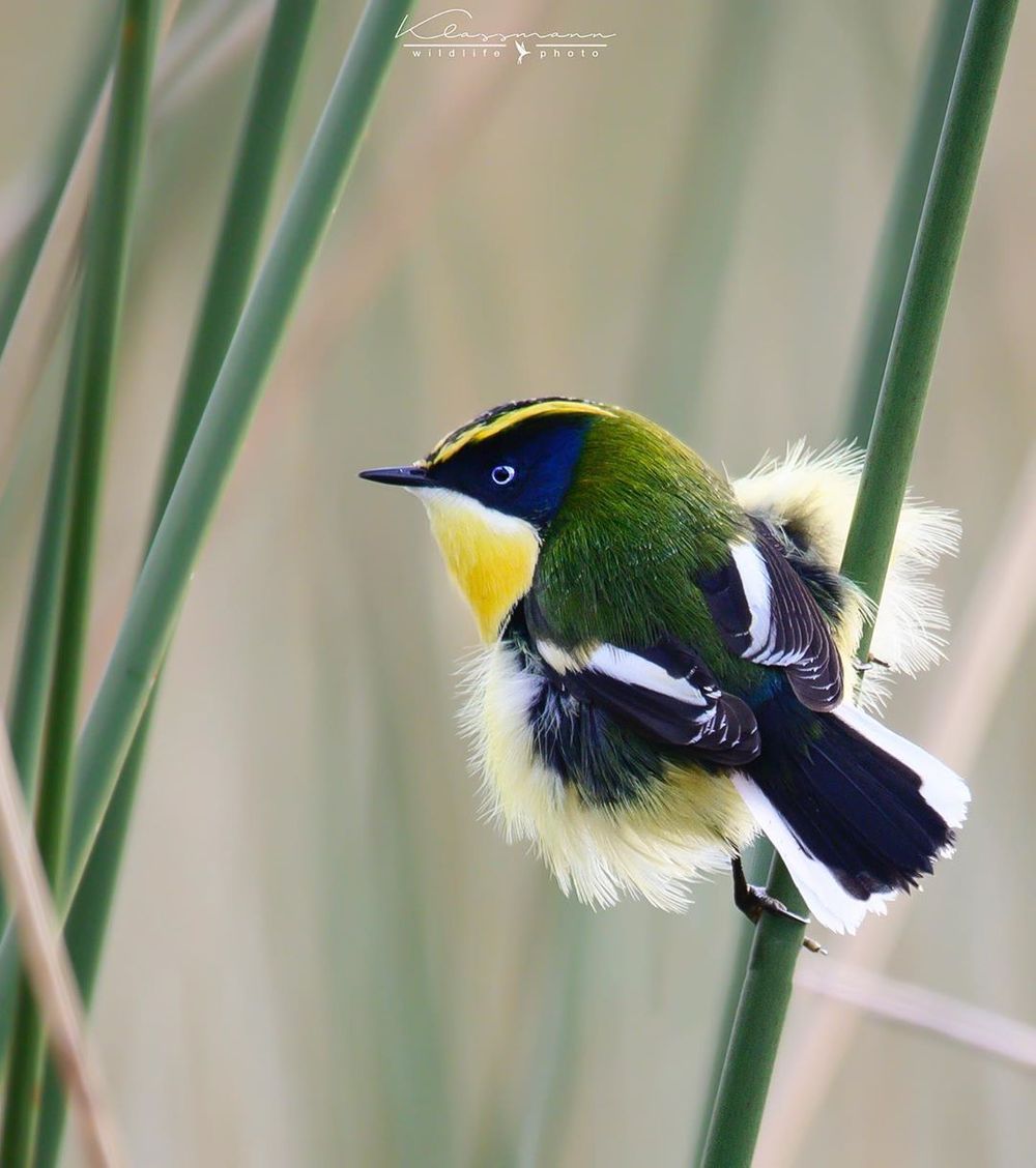 ▼多色葦霸鶲身材小巧,大約只有7、8公分,外型圓潤,看起來很可愛。牠的身上有藍、綠、黃、黑、白等色的羽毛,翅膀下還有一點橘色。