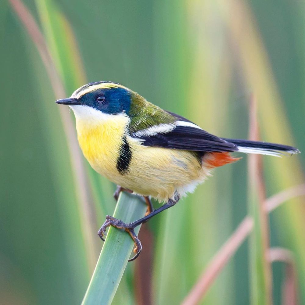 ▼多色葦霸鶲的腳結構很特別,這能讓牠們輕鬆站在蘆葦上。這種鳥食物多樣,屬於霸鶲科。