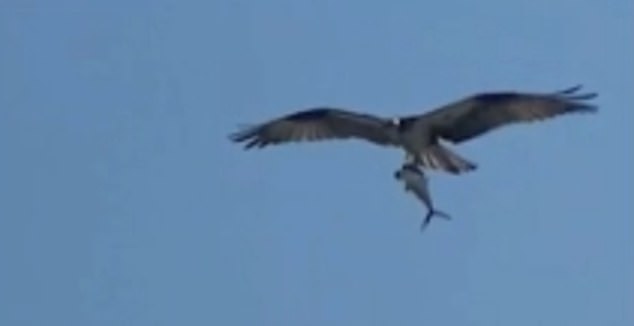 ▼魚鷹很擅長捕魚,能適應多種棲息環境,只要食物充足,在水域周圍的任何地點都能築巢。不過在畫面放大後,野生動植物專欄作家埃德基勒(Ed Killer)指出,被抓的魚應該不是鯊魚,而是北梭魚。