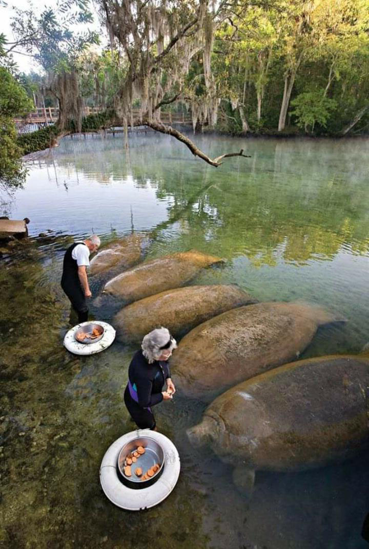 ▼最近一組老人給海牛餵食的照片在網路上流傳。這組照片是在Ellie Schiller Homosassa Springs野生動物州立公園拍攝的。只見一對老夫婦站在淺淺的河水中,給一群海牛餵蕃薯片。5隻體型壯碩的海牛排排站,乖巧等待投餵,那一幕非常可愛。
