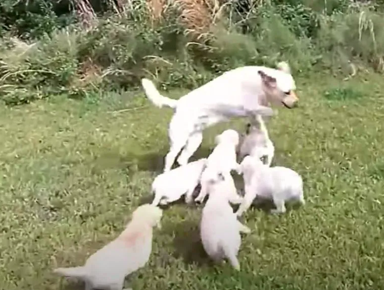 ▼第一隻小狗成功後,其他小狗也有了下水的勇氣,終於展現出愛玩水的本性。第一堂游泳課結束後,爸爸帶著小狗們到草地上奔跑玩耍。這位爸爸很負責任,牠關注著每一隻小狗的情況,保證孩子們不會落單、迷路回不了家。