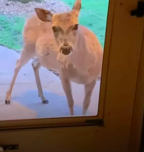 ▼現在Buttons經常會回來跟G-Bro見面。牠會在門口等待好友,如果沒有人發現牠,牠還會敲門提醒。牠升格為媽媽後,曾帶G-Bro去見自己的小孩。一般鹿媽媽都非常警惕,不願意讓其他動物接近自己的小孩,但Buttons非常信任G-Bro,知道牠會溫柔對待自己的孩子。
