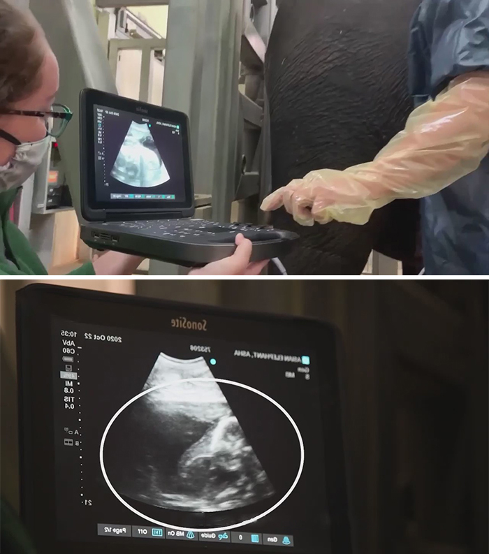 ▼從超音波掃描圖能清楚看到,Asha肚子裡的象寶寶已經有頭部、腿部和象鼻。Asha和寶寶的狀況都非常穩定,Asha預計於2022年2月生產,相信那時候就能跟這隻可愛的小象見面了。