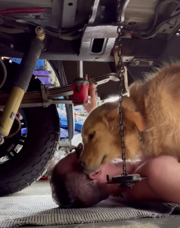 2024年02月08日這讓人怎麼專心修車?澳洲一位飼主養了兩隻黃金獵犬,分別是Lexi和Lola。這2隻可愛的狗狗非常黏人,那天把拔在車庫修車時,其中一隻狗狗竟然跟著鑽進車底。牠撲到把拔懷裡猛力撒嬌,一直在干擾把拔工作,讓把拔哭笑不得~