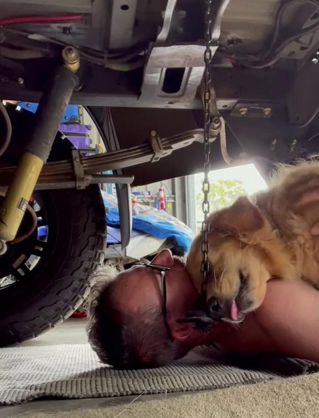黏你到天涯海角!把拔在修車「阿金硬要鑽車底」 甜蜜索吻:快抱抱偶♡