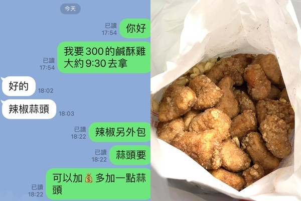 ▼從原po分享的截圖可以看到,他表示要300的鹹酥雞,大約9點半去拿。老闆很快回覆,並詢問要不要放辣椒、蒜頭。他回說「辣椒另外包,蒜頭要,可以加錢多點蒜頭」。但他打字時少打了一個「配」字,取餐時獲得了一份300元超大份量的鹹酥雞。他覺得這件事很好笑,所以跟大家分享,並說沒有怪店家的意思。