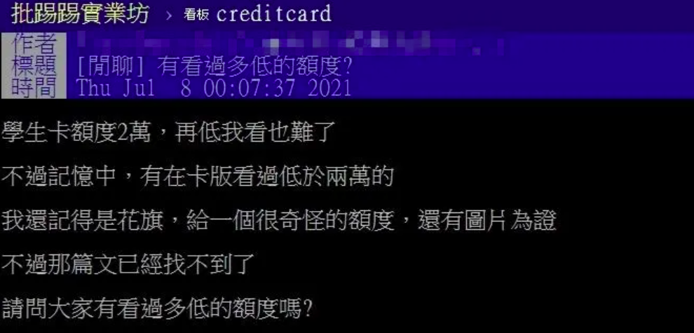 ▼原po認為學生信用卡額度2萬元已經非常低了,應該不太可能比這個數字還要低,於是好奇發問:「請問大家有看過多低的額度嗎?」