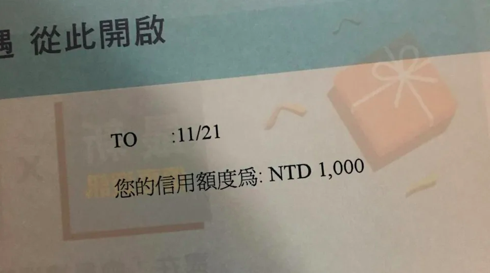 ▼還有人曬出一張信用卡額度只有1000元的照片,上面竟寫著:「您的信用額度為:NTD1,000。」