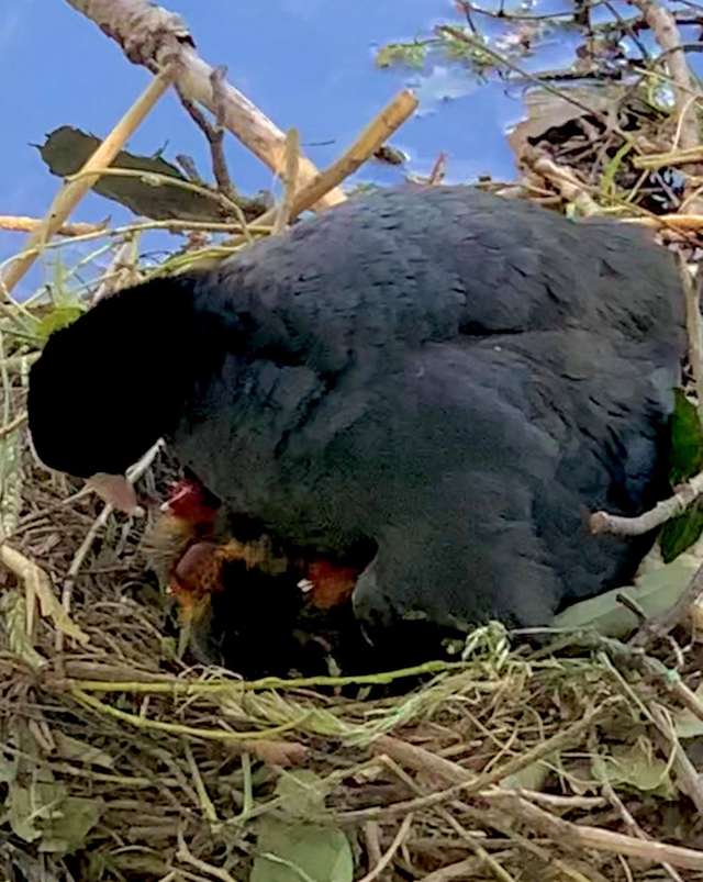 ▼在Ian和Jan的幫助下,這兩隻水鳥築巢的效率大大提高。後來兩人又去公園散步,路過水姑丁們的巢時,發現裡面已經多了幾隻剛剛孵化出來的小鳥。