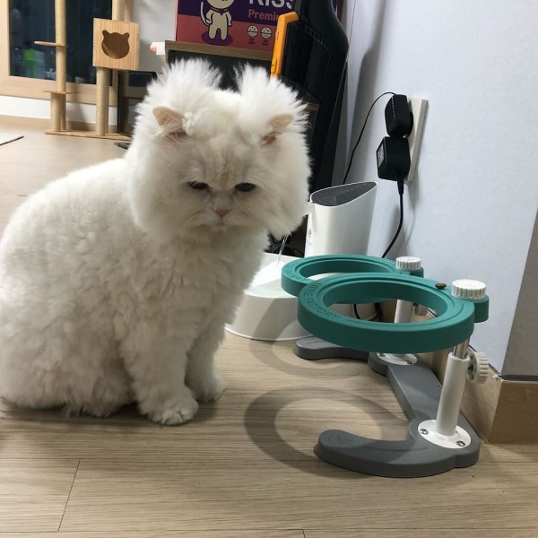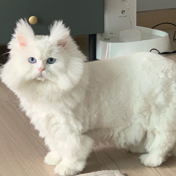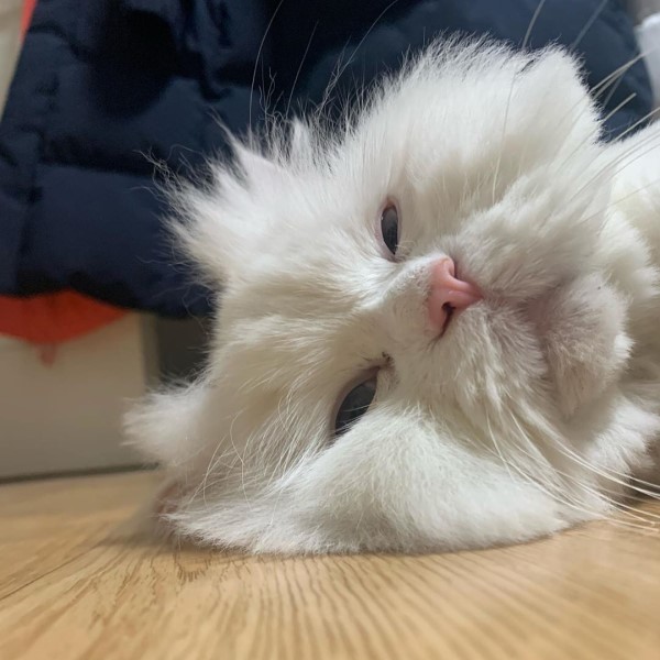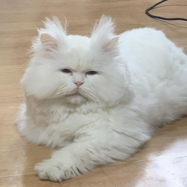 ▼這隻貓咪全身雪白,毛毛比較厚實,看起來就像一隻萌萌的小熊。最讓人驚奇的是,牠臉部的毛毛格外旺盛,就像一張大餅臉。