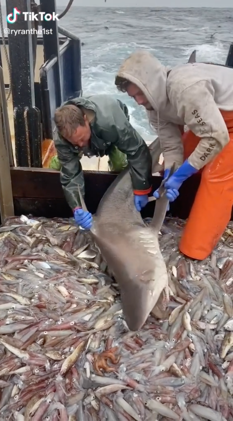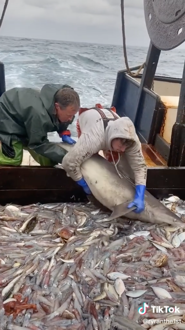 ▼從Ryan上傳到TikTok上的影片可以看到,船上的魚堆中有一隻鯊魚,牠不急著逃走,反而不斷吞吃周圍的小魚。2名漁夫在鯊魚身後,想把牠拖回大海裡,但鯊魚不願意離開,反而想要留下來繼續吃大餐。漁夫和鯊魚在甲板上展開拉扯,一時之間竟僵持起來。