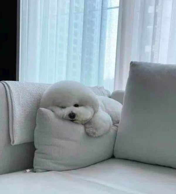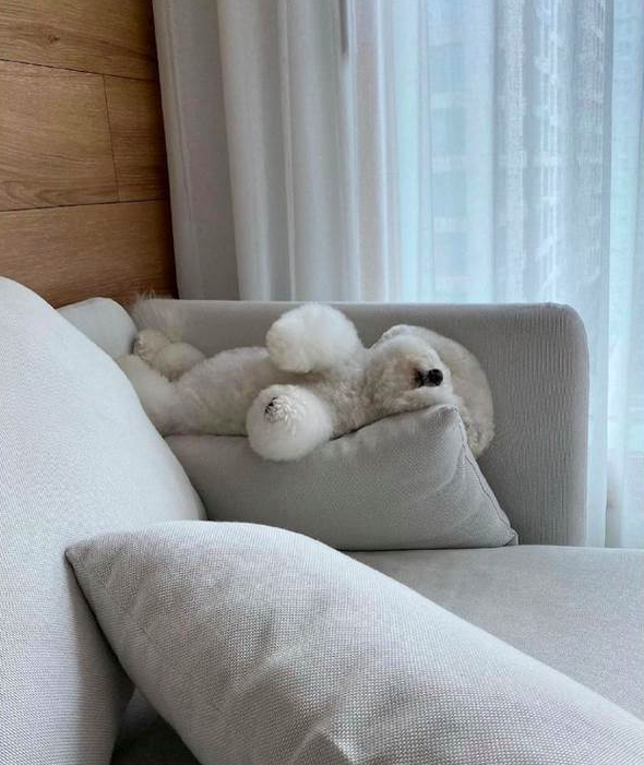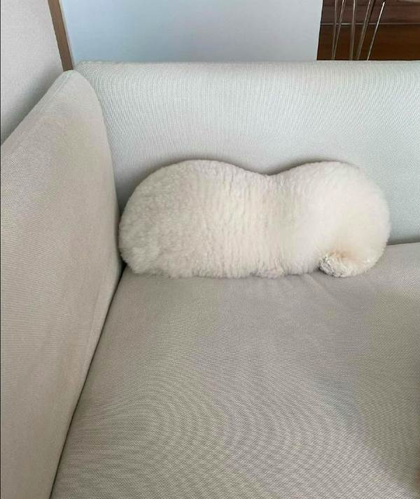 ▼這隻狗狗的毛髮是白色的,家裡的傢俱也以白色調為主。狗狗躺在上面一動不動的時候,很容易讓人產生錯覺。那天主人回到家,往狗狗平時喜歡躺的地方看了一下,竟然沒有發現牠的蹤跡。主人找了好一會兒,才看到牠正趴在沙發上睡覺。