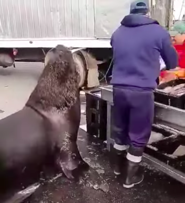 ▼有人說海獅餓極了,這才跑到魚市要吃的;也有人說牠可能是住在附近海域的海獅,工作人員都認識牠,也早就習慣牠的造訪了: