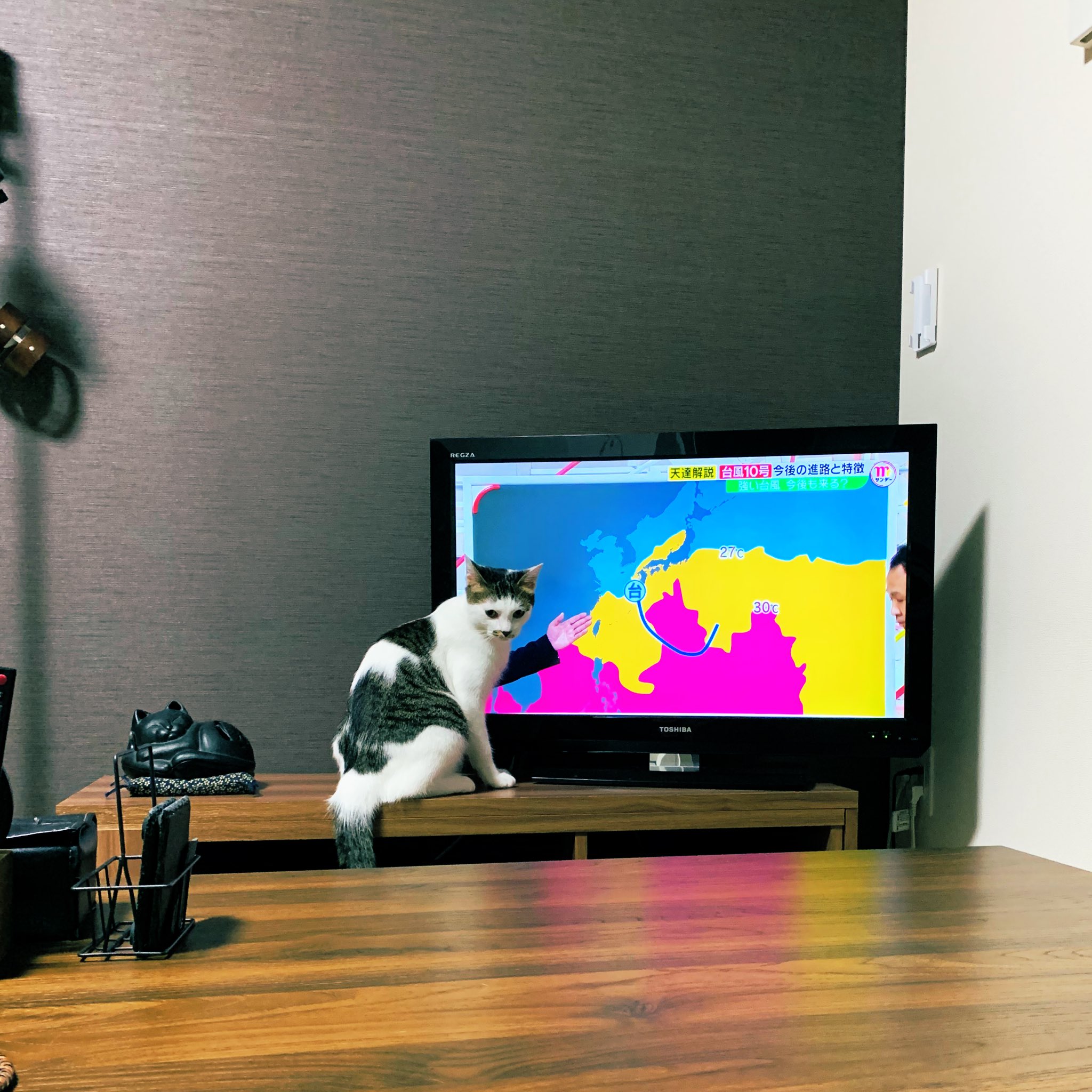 ▼貓咪坐在電視機前,眼神平靜又自信。牠的嘴邊有鬍子,看起來更加穩重。再加上那專業的手手,牠來介紹天氣情況,所有人都會搶著看!推主將照片po到推特上,笑著註解這是:「正在說明颱風動態的貓貓主播。」