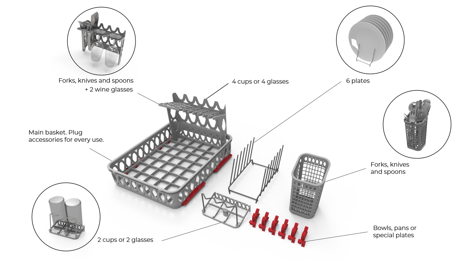 ▼洗碗機的配件包括碟架、杯架,可以自由調整組合。一次可以洗5個盤子、2個玻璃杯、4個馬克杯、2個碗、6件刀叉;或者一次清洗16個玻璃杯。
