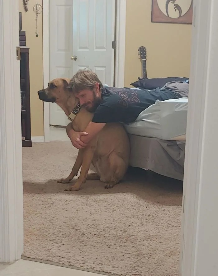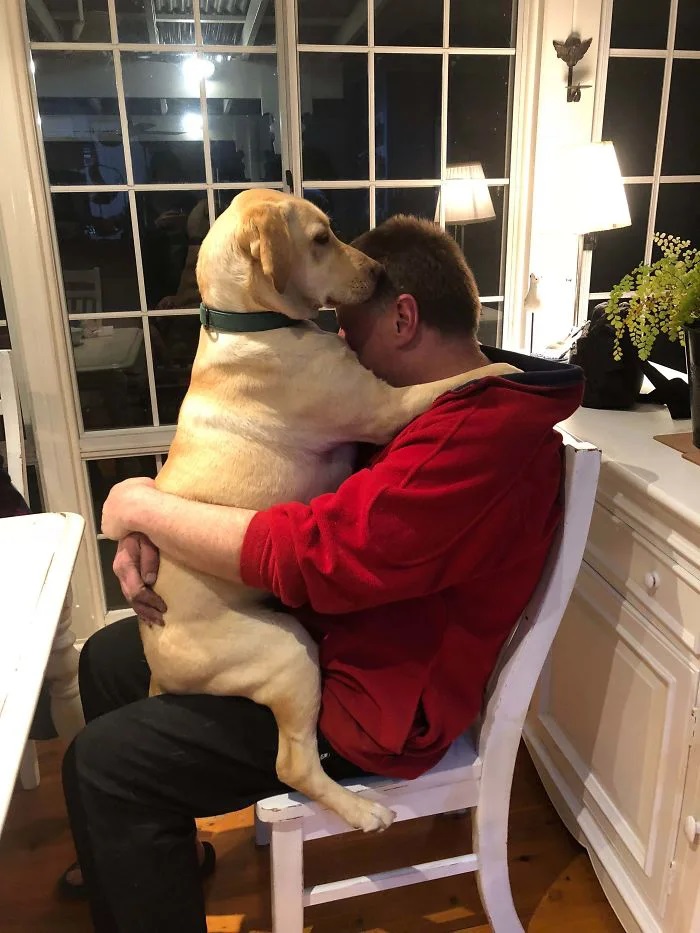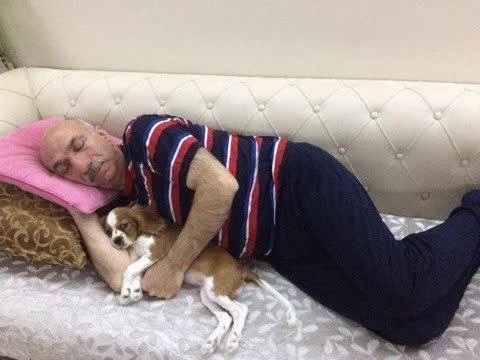 ▼原本超討厭動物的爸爸,現在每天都要跟狗狗抱在一起才能睡個好覺。